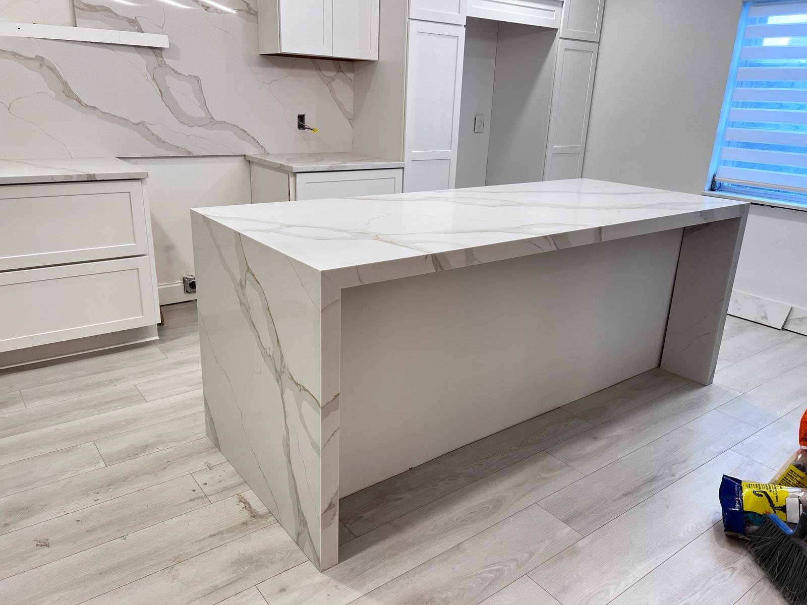 Waterfall is the vertical continuation from the countertop to the ground, forming an inverted L shape, or a Leg shape. Miter Edge is the finishing type of the edge itself, representing a bolder look as a thicker material compared to regular non-mitered edges.